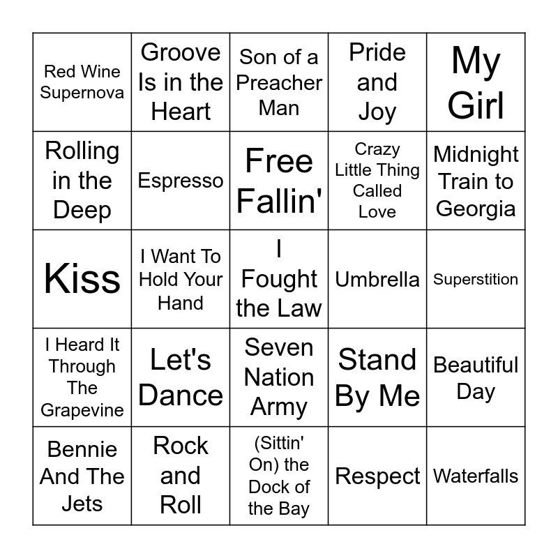 This bingo card has a free space and 34 words: I Can't Get No Satisfaction, Respect, I Walk the Line, Levitating, I Heard It Through The Grapevine, Espresso, My Girl, Bennie And The Jets, Groove Is in the Heart, Once in a Lifetime, Free Fallin', Son of a Preacher Man, Born in the U.S.A., Into the Groove, Umbrella, Midnight Train to Georgia, Rock and Roll, Kiss, Let's Dance, Stand By Me, Seven Nation Army, Hey Ya!, Red Wine Supernova, Superstition, (Sittin' On) the Dock of the Bay, Waterfalls, Pride and Joy, Upside Down, Crazy Little Thing Called Love, Rolling in the Deep, Freedom! '90, I Want To Hold Your Hand, Beautiful Day and Bad Moon Rising.