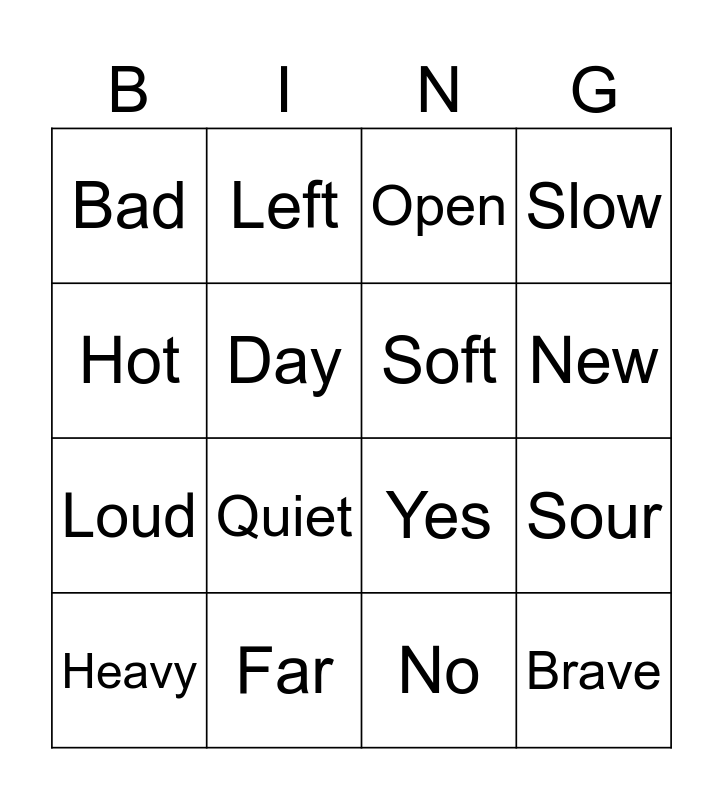 This bingo card has 24 words: Short, Fast, New, Dry, Hot, Bad, Day, Left, Far, Happy, Loud, Yes, Up, Clean, Soft, Right, No, Open, Quiet, Sour, Heavy, Brave, Slow and Full.