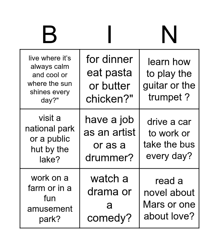This bingo card has a free space and 8 words: drive a car to work or take the bus every day?, learn how to play the guitar or the trumpet ?, for dinner eat pasta or butter chicken?", work on a farm or in a fun amusement park?, live where it’s always calm and cool or where the sun shines every day?", read a novel about Mars or one about love?, visit a national park or a public hut by the lake? and watch a drama or a comedy?.