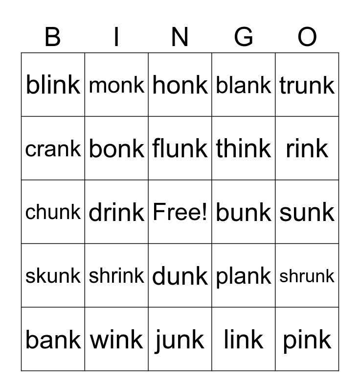 This bingo card has a free space and 29 words: bank, stink, drink, tank, blink, honk, bonk, shrink, bunk, wink, sunk, pink, junk, link, rink, rank, dunk, skunk, trunk, chunk, plank, prank, think, crank, blank, monk, shrunk, flunk and stank.