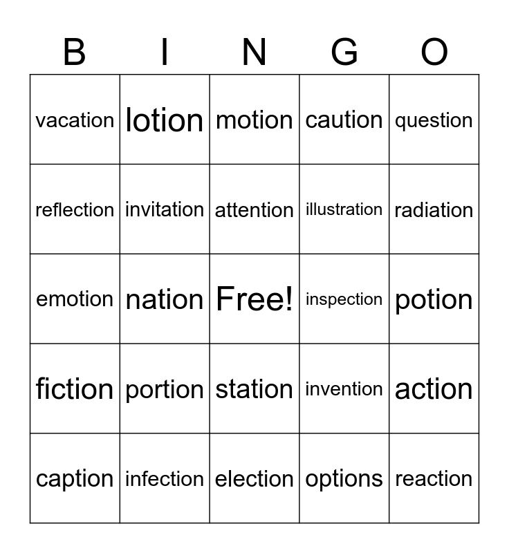 This bingo card has a free space and 26 words: station, options, attention, infection, question, vacation, reflection, lotion, potion, invention, illustration, emotion, action, caption, nation, imagination, caution, fiction, motion, reaction, radiation, election, inspection, portion, invitation and decoration.