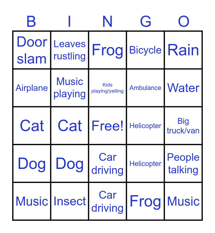 ⚠ This card has duplicate items: Water (2), Music (2), Bird (2), Car driving (2), Dog (2), Wind (2), Leaves rustling (2), Car alarm (2), Airplane (2), Insect (2), Music playing (2), Bicycle (2), People talking (2), Helicopter (3), Big truck/van (2), Footsteps (2), Kids playing/yelling (2), Motorcycle (2), Rain (2), Cat (2), Frog (2), Door slam (2), Ambulance (2), Thunder (2)