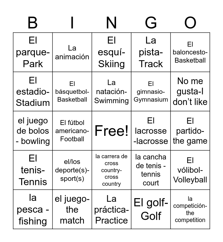 This bingo card has a free space and 32 words: El golf-Golf, El fútbol-Soccer, El fútbol americano-Football, El béisbol-Baseball, El tenis-Tennis, El básquetbol-Basketball, El baloncesto-Basketball, El vólibol-Volleyball, La animación, El hockey-Hockey, La natación-Swimming, El esquí-Skiing, La lucha libre-Wrestling, El atletismo-Track, El lacrosse -lacrosse, el fútbol bandera - flag football, la pesca - fishing, el juego de bolos - bowling, la carrera de cross country- cross country, el/los deporte(s)- sport(s), la cancha de tenis - tennis court, el campo de fútbol - soccer field, El partido- the game, el juego- the match, la competición-the competition, La pista-Track, El gimnasio-Gymnasium, El estadio-Stadium, El parque-Park, La práctica-Practice, Me gusta-I like and No me gusta-I don’t like.