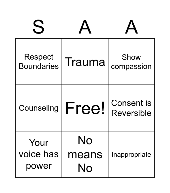 This bingo card has a free space and 8 words: Consent is Reversible, Show compassion, Trauma, Your voice has power, Respect Boundaries, Inappropriate, Counseling and No means No.