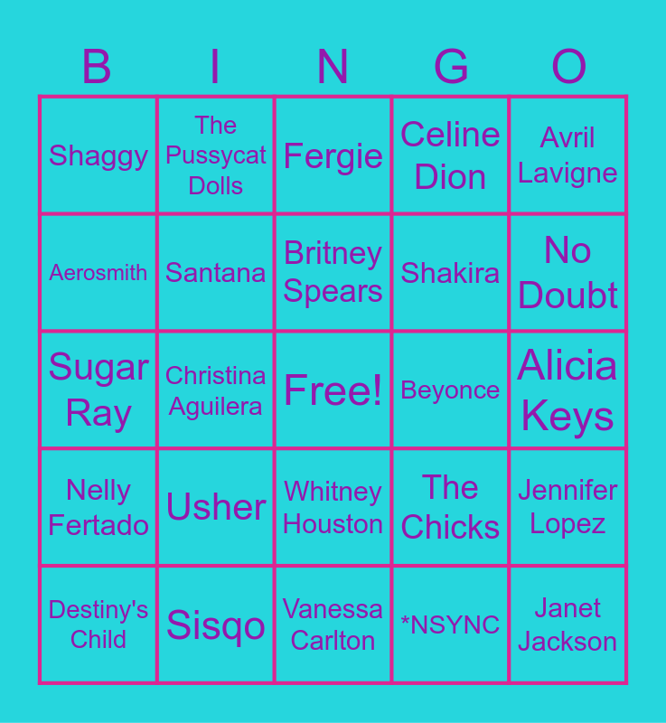 This bingo card has a free space and 39 words: Outkast, Faith Hill, Joe, Santana, Destiny's Child, Whitney Houston, Britney Spears, Nelly, Avril Lavigne, Nelly Fertado, Christina Aguilera, Celine Dion, Janet Jackson, Alicia Keys, Beyonce, Usher, Dream, Shaggy, S Club 7, The Chicks, Aerosmith, Vanessa Carlton, Shakira, No Doubt, Kelly Clarkson, Chingy, Ciara, Snoop Dogg, 50 Cent, The Pussycat Dolls, Black Eyed Peas, Backstreet Boys, Fergie, Sisqo, *NSYNC, Missy Eliot, Jennifer Lopez, Sugar Ray and Enrique Iglesias.