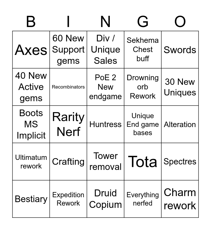 This bingo card has a free space and 24 words: Crafting, Expedition Rework, PoE 2 New endgame, Bestiary, Swords, Axes, 40 New Active gems, 60 New Support gems, Unique End game bases, Tower removal, Drowning orb Rework, Boots MS Implicit, Tota, Spectres, Recombinators, Everything nerfed, Alteration, Div / Unique Sales, 30 New Uniques, Rarity Nerf, Charm rework, Ultimatum rework, Sekhema Chest buff and Druid Copium.