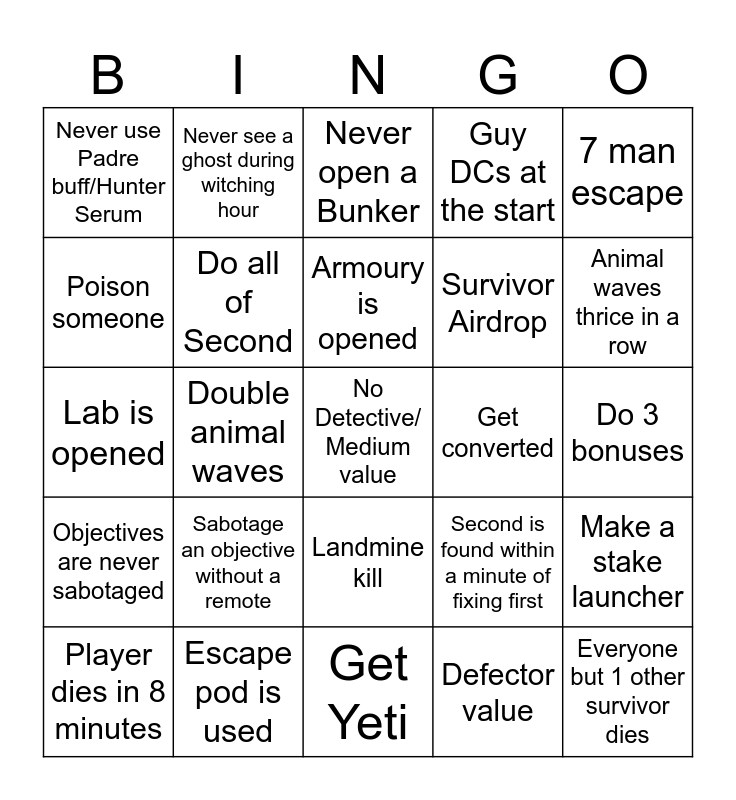 This bingo card has 25 words: Objectives are never sabotaged, Escape pod is used, No Detective/ Medium value, Defector value, 7 man escape, Never use Padre buff/Hunter Serum, Never see a ghost during witching hour, Never open a Bunker, Get converted, Make a stake launcher, Poison someone, Do all of Second, Get Yeti, Second is found within a minute of fixing first, Animal waves thrice in a row, Player dies in 8 minutes, Double animal waves, Armoury is opened, Survivor Airdrop, Do 3 bonuses, Lab is opened, Sabotage an objective without a remote, Landmine kill, Guy DCs at the start and Everyone but 1 other survivor dies.