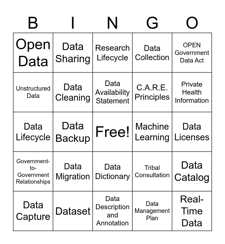 This bingo card has a free space and 97 words: Big Data, Biomedical Informatics, Database, Data Backup, Artificial Intelligence, Data Integrity, Data Integration, De-Identified Data, Indigenous Data, Indigenous Data Sovereignty, Institutional Review Boards, Data Normalization, Data Governance, Government-to-Government Relationships, O.C.A.P. Principles, Open Data, OPEN Government Data Act, Open Science, Data Orchestration, DataOps, Data Ownership, Data, Data Analysis, Data Analytics, Data Architecture, Data Availability Statement, Data Capture, Data Catalog, Data Center, Data Citation, Data Cleaning, Data Collection, Data Curation ¬, Data Dashboard, Data Description and Annotation, Data Dictionary, Data Ecosystem, Data Enclave, Data Ethics, Data Lifecycle, Data Literacy, Data Licenses, Data Management, Data Management Plan, Data Migration, Data Mining, Data Modeling, Data Replication, Data Preservation, Data Privacy, Data Provenance, Data Publication, Data Quality, Data Reuse, Data Science, Data Scientist, Data Security, Data Sharing, Data Sovereignty, Data Standard, Data Stewardship, Data Transfer, Data Transformation, Data Upload, Data Use Agreement, Data Validation, Data Virtualization, Data Visualization, Data Wrangling, Dataset, C.A.R.E. Principles, Electronic Health Record Data, F.A.I.R. Principles, Federal Trust Responsibility, FERPA, HIPPA, Library Data Services, Linked Data, Machine Learning, Metadata, Persistent Unique Identifier, Private Health Information, Protocol, Qualitative Data, Quantitative Data, Raw Data, Real-Time Data, REDCap, Repository, Reproducibility, Research Lifecycle, Semi-Structured Data, Structured Data, Tribal Consultation, Unstructured Data, Usable Data and Variable.