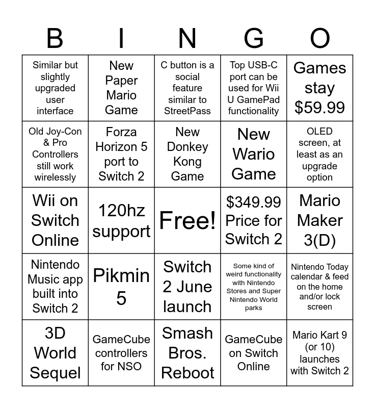 This bingo card has a free space and 24 words: 3D World Sequel, Pikmin 5, New Donkey Kong Game, GameCube on Switch Online, Games stay $59.99, Similar but slightly upgraded user interface, New Paper Mario Game, C button is a social feature similar to StreetPass, $349.99 Price for Switch 2, Mario Maker 3(D), Wii on Switch Online, Forza Horizon 5 port to Switch 2, Some kind of weird functionality with Nintendo Stores and Super Nintendo World parks, Nintendo Today calendar & feed on the home and/or lock screen, Old Joy-Con & Pro Controllers still work wirelessly, GameCube controllers for NSO, Smash Bros. Reboot, Top USB-C port can be used for Wii U GamePad functionality, OLED screen, at least as an upgrade option, Nintendo Music app built into Switch 2, 120hz support, Switch 2 June launch, New Wario Game and Mario Kart 9 (or 10) launches with Switch 2.