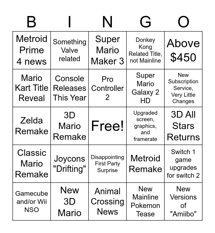 This bingo card has a free space and 24 words: Joycons "Drifting", New 3D Mario, Pro Controller 2, Gamecube and/or Wii NSO, Above $450, Metroid Prime 4 news, Mario Kart Title Reveal, Something Valve related, Upgraded screen, graphics, and framerate, Disappointing First Party Surprise, Super Mario Galaxy 2 HD, Zelda Remake, Metroid Remake, Switch 1 game upgrades for switch 2, Console Releases This Year, New Mainline Pokemon Tease, 3D All Stars Returns, Super Mario Maker 3, New Subscription Service, Very Little Changes, 3D Mario Remake, New Versions of "Amiibo", Classic Mario Remake, Donkey Kong Related Title, not Mainline and Animal Crossing News.