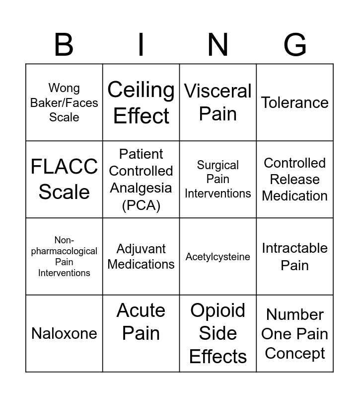 This bingo card has 16 words: Acute Pain, Intractable Pain, Visceral Pain, Wong Baker/Faces Scale, Non-pharmacological Pain Interventions, Ceiling Effect, Acetylcysteine, Opioid Side Effects, FLACC Scale, Patient Controlled Analgesia (PCA), Naloxone, Tolerance, Adjuvant Medications, Controlled Release Medication, Surgical Pain Interventions and Number One Pain Concept.