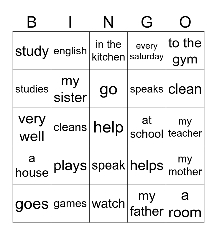 This bingo card has a free space and 24 words: plays, games, go, goes, to the gym, study, studies, english, at school, speak, speaks, very well, helps, my mother, my sister, my father, my teacher, in the kitchen, clean, cleans, a room, a house, every saturday and watch.