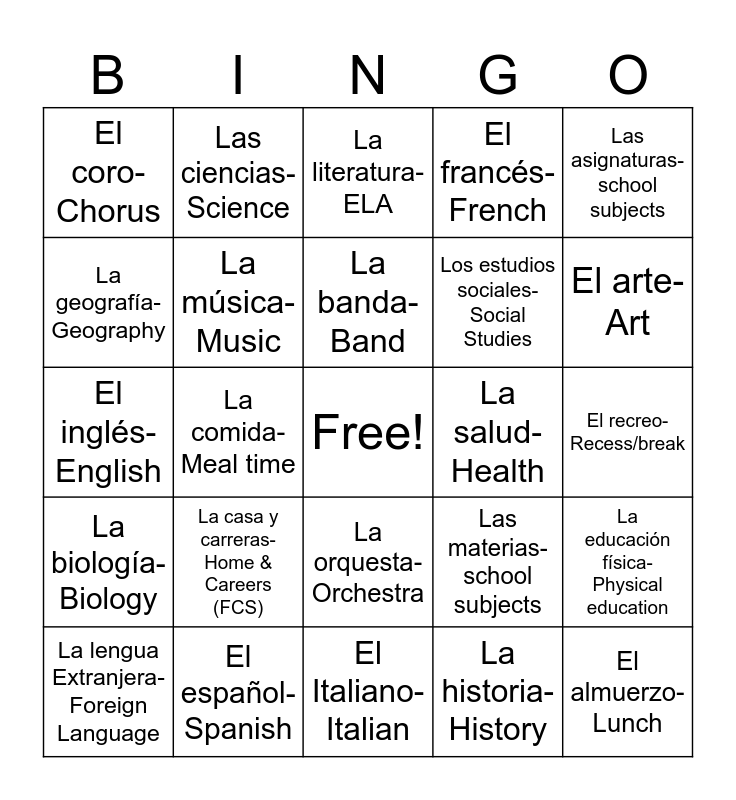 This bingo card has a free space and 28 words: La educación física-Physical education, Las matemáticas-Math, Los estudios sociales-Social Studies, La historia-History, La geografía-Geography, La literatura-ELA, Las ciencias-Science, La biología-Biology, La salud-Health, La lengua Extranjera-Foreign Language, El inglés-English, El francés-French, El español-Spanish, El Italiano-Italian, El arte-Art, La tecnología-technology, La casa y carreras-Home & Careers (FCS), La música-Music, La banda-Band, La orquesta-Orchestra, El coro-Chorus, El drama-Drama, El almuerzo-Lunch, La comida-Meal time, El recreo-Recess/break, Las materias- school subjects, Las asignaturas-school subjects and Las clases -classes.