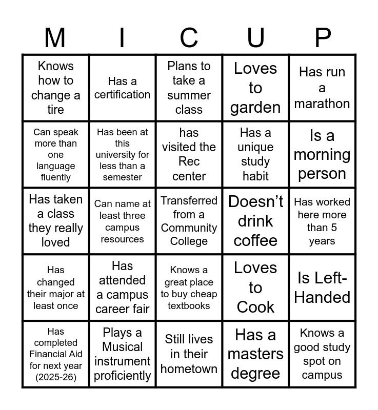 This bingo card has a free space and 34 words: Is the same major is you, Has participated in a study group, Is involved in a student club or organization, Has worked here less than 1 month, Has worked here more than 5 years, Can speak more than one language fluently, Has been at this university for less than a semester, Still lives in their hometown, Has a unique study habit, Knows a good study spot on campus, Has taken a class they really loved, Has a certification, Has a masters degree, Has attended a professor's office hours, Has changed their major at least once, Can name at least three campus resources, Knows a great place to buy cheap textbooks, Doesn’t drink coffee, Is Left-Handed, Has completed Financial Aid for next year (2025-26), Plays a Musical instrument proficiently, Has read more than 10 books this year, Loves to garden, Is a morning person, Has taken an online class before, Has attended a campus career fair, Plans to take a summer class, knows how many skywalks are on campus, Has run a marathon, Knows how to change a tire, has met with their advisor this semester, has visited the Rec center, Loves to Cook and Knows what EOI stands for.