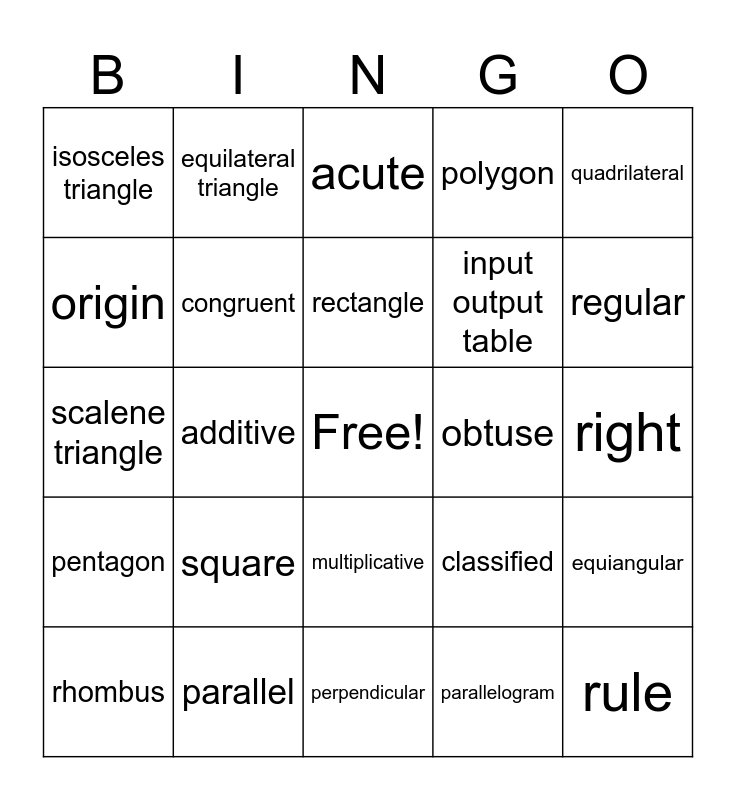 This bingo card has a free space and 24 words: rhombus, square, rectangle, parallelogram, quadrilateral, isosceles triangle, equilateral triangle, acute, obtuse, right, scalene triangle, congruent, classified, equiangular, origin, parallel, perpendicular, polygon, regular, pentagon, additive, multiplicative, input output table and rule.