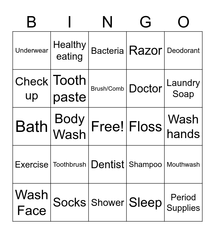 This bingo card has a free space and 25 words: Toothbrush, Shower, Brush/Comb, Wash Face, Deodorant, Underwear, Check up, Healthy eating, Floss, Dentist, Doctor, Bath, Shampoo, Mouthwash, Tooth paste, Germs, Wash hands, Bacteria, Laundry Soap, Body Wash, Period Supplies, Socks, Exercise, Razor and Sleep.