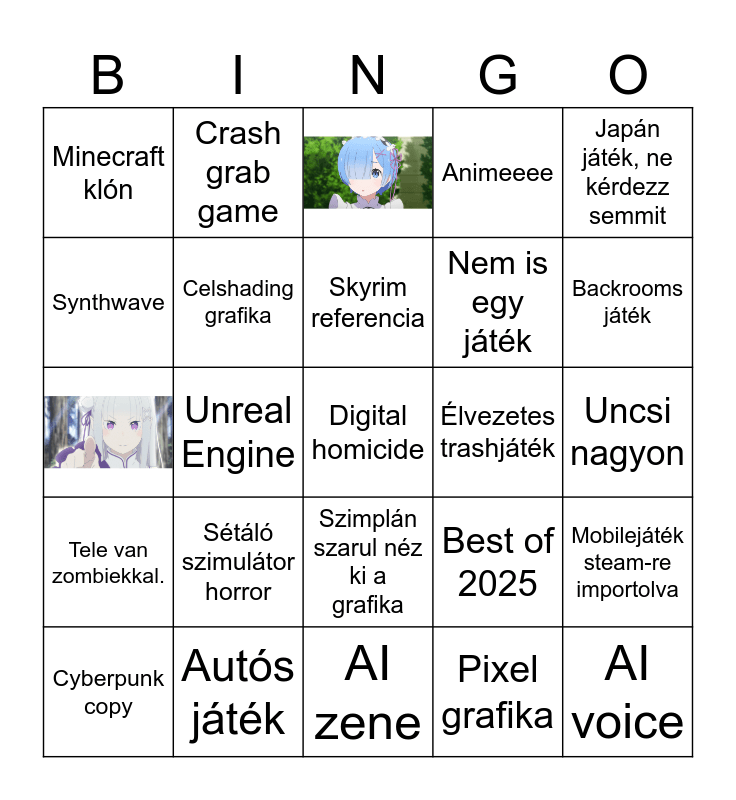This bingo card has 2 images, a free space and 47 words: GTA klón, AI voice, AI kép, AI zene, Sétáló szimulátor horror, Ingyen játék, Crash grab game, "Legalább occsó volt", Synthwave, "Fúj nővan ajátékban", Celshading grafika, Animeeee, Mobilejáték steam-re importolva, Best of 2025, Unity game, Átbugolsz mindenen, Skyrim referencia, Élvezetes trashjáték, Mind fuckgame, Japán játék, ne kérdezz semmit, Unreal Engine, Pixel grafika, Minecraft klón, Nem is egy játék, Ingyenes hely, Backrooms játék, Cyberpunk copy, Instant refund, Szimplán szarul néz ki a grafika, Tele van zombiekkal., Fallout jobb mint a Starfield, 100%-on pörgeti a kártyám a játék, Logikai játék, Liminal space, Autós játék, No colision objektumok, Dicső Szovjetúnió, Valami hentai puzzle game, Uncsi nagyon, Nem tudom mit kell ebben a játékban csinálni, Kék halált kap a gépem, Rage game, Ingyenes assetekből felépített játék, Paródia game, Csatorna tagság promó, Fallout referencia and Egy próbát megér.
