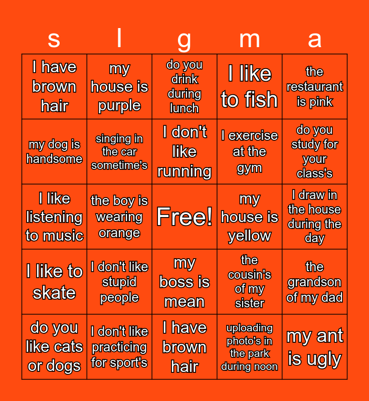 This bingo card has a free space and 24 words: I don't like stupid people, I don't like practicing for sport's, I don't like running, do you like cats or dogs, the restaurant is pink, I have brown hair, my dog is handsome, my house is purple, my house is yellow, my boss is mean, I exercise at the gym, I like listening to music, the cousin's of my sister, the grandson of my dad, singing in the car sometime's, uploading photo's in the park during noon, I draw in the house during the day, do you drink during lunch, do you study for your class's, the boy is wearing orange, my ant is ugly, I like to skate, I like to fish and I have brown hair.