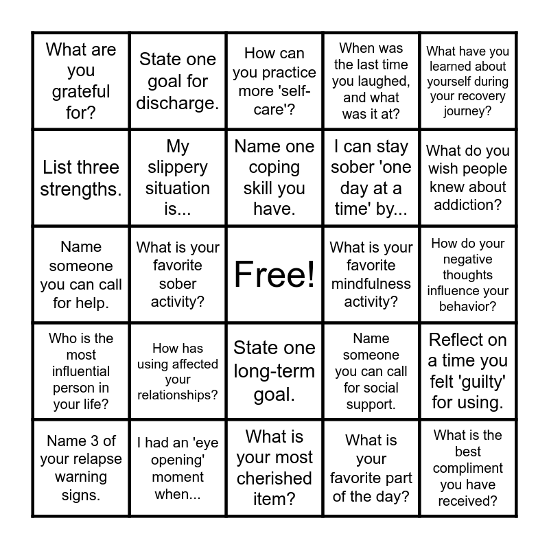 This bingo card has a free space and 24 words: How has using affected your relationships?, I had an 'eye opening' moment when..., Name one coping skill you have., Name 3 of your relapse warning signs., What have you learned about yourself during your recovery journey?, What are you grateful for?, List three strengths., State one goal for discharge., What is your favorite mindfulness activity?, State one long-term goal., I can stay sober 'one day at a time' by..., Name someone you can call for help., Name someone you can call for social support., Reflect on a time you felt 'guilty' for using., My slippery situation is..., What is your favorite part of the day?, How do your negative thoughts influence your behavior?, How can you practice more 'self-care'?, What do you wish people knew about addiction?, What is your favorite sober activity?, What is the best compliment you have received?, Who is the most influential person in your life?, When was the last time you laughed, and what was it at? and What is your most cherished item?.