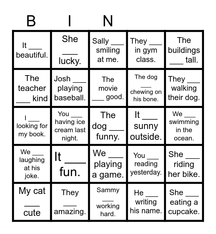 This bingo card has a free space and 24 words: It ___ fun., They ___ amazing., The movie ___ good., My cat ___ cute, The buildings ___ tall., It ___ beautiful., The teacher ___ kind, She ___ lucky., It ___ sunny outside., We ___ playing a game., The dog ___ chewing on his bone., I ___ looking for my book., You ___ reading yesterday., She ___ riding her bike., Josh ___ playing baseball., He ___ writing his name., We ___ swimming in the ocean., Sally ___ smiling at me., They ___ walking their dog., You ___ having ice cream last night., She ___ eating a cupcake., We ___ laughing at his joke., They ___ in gym class. and Sammy ___ working hard..