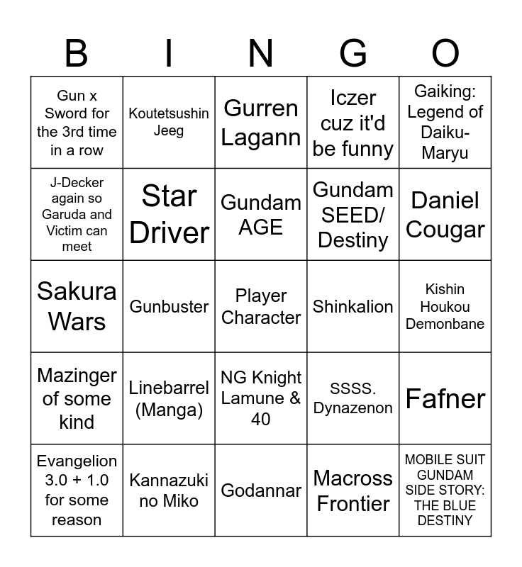 This bingo card has a free space and 24 words: Linebarrel (Manga), Kannazuki no Miko, Gundam AGE, Evangelion 3.0 + 1.0 for some reason, Gaiking: Legend of Daiku-Maryu, Gun x Sword for the 3rd time in a row, J-Decker again so Garuda and Victim can meet, Koutetsushin Jeeg, Shinkalion, NG Knight Lamune & 40, Gundam SEED/ Destiny, Sakura Wars, SSSS. Dynazenon, Fafner, Star Driver, Macross Frontier, Kishin Houkou Demonbane, Gurren Lagann, Daniel Cougar, Gunbuster, MOBILE SUIT GUNDAM SIDE STORY: THE BLUE DESTINY, Mazinger of some kind, Iczer cuz it'd be funny and Godannar.