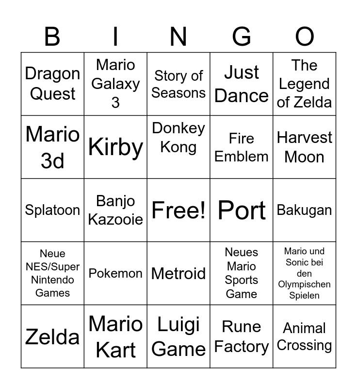 This bingo card has a free space and 24 words: Pokemon, Mario Kart, Donkey Kong, Zelda, The Legend of Zelda, Dragon Quest, Mario 3d, Mario Galaxy 3, Port, Metroid, Fire Emblem, Splatoon, Neues Mario Sports Game, Mario und Sonic bei den Olympischen Spielen, Kirby, Rune Factory, Bakugan, Story of Seasons, Harvest Moon, Banjo Kazooie, Animal Crossing, Neue NES/Super Nintendo Games, Just Dance and Luigi Game.