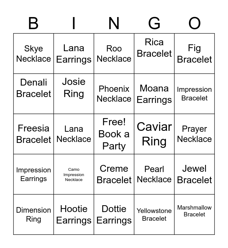 This bingo card has a free space and 24 words: Camo Impression Necklace, Hootie Earrings, Phoenix Necklace, Dimension Ring, Fig Bracelet, Skye Necklace, Denali Bracelet, Lana Earrings, Caviar Ring, Creme Bracelet, Moana Earrings, Freesia Bracelet, Pearl Necklace, Jewel Bracelet, Josie Ring, Yellowstone Bracelet, Prayer Necklace, Roo Necklace, Impression Bracelet, Lana Necklace, Marshmallow Bracelet, Impression Earrings, Rica Bracelet and Dottie Earrings.