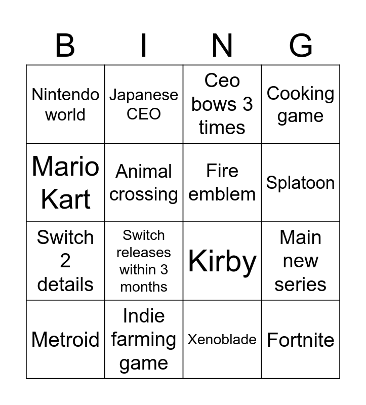 This bingo card has 16 words: Indie farming game, Main new series, Ceo bows 3 times, Nintendo world, Switch 2 details, Japanese CEO, Kirby, Xenoblade, Mario Kart, Animal crossing, Metroid, Cooking game, Switch releases within 3 months, Splatoon, Fire emblem and Fortnite.