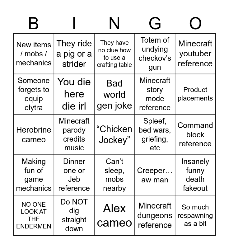 This bingo card has a free space and 24 words: Dinner one or Jeb reference, Do NOT dig straight down, Bad world gen joke, NO ONE LOOK AT THE ENDERMEN, Minecraft youtuber reference, New items / mobs / mechanics, Someone forgets to equip elytra, They ride a pig or a strider, Spleef, bed wars, griefing, etc, Can’t sleep, mobs nearby, Minecraft story mode reference, Herobrine cameo, Creeper… aw man, Insanely funny death fakeout, You die here die irl, Minecraft dungeons reference, Command block reference, They have no clue how to use a crafting table, Product placements, Minecraft parody credits music, So much respawning as a bit, Making fun of game mechanics, Totem of undying checkov’s gun and Alex cameo.