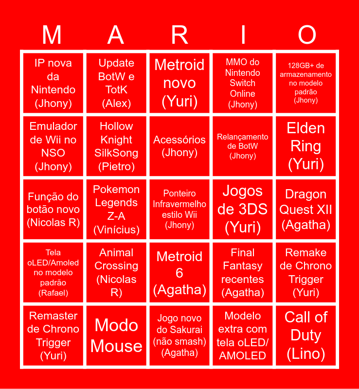 This bingo card has 60 words: Adaptive Triggers nos controles (Rafael), Modo Mouse, HD Rumble 2.0 (Rafael), Tela oLED/Amoled no modelo padrão (Rafael), Modelo extra com tela oLED/ AMOLED, Zelda novo no lançamento (Rafael), Hollow Knight SilkSong (Pietro), Zelda 3D Remake (Jhony), Relançamento de BotW (Jhony), Mario Kart 9 (Jhony), MMO do Nintendo Switch Online (Jhony), Emulador de DS no NSO (Jhony), Emulador de Wii no NSO (Jhony), Emulador de GameCube no NSO (Agatha), Jogo de fazendinha, IP nova da Nintendo (Jhony), Ponteiro Infravermelho estilo Wii (Jhony), 128GB+ de armazenamento no modelo padrão (Jhony), DLSS (Jhony), Acessórios (Jhony), Jogos de 3DS (Yuri), Metroid novo (Yuri), Remaster de Chrono Trigger (Yuri), Remake de Chrono Trigger (Yuri), Jogos pesados rodando no console - RDR2, CyberPunk, etc. (Yuri), Novo Bayonetta (Yuri), Novo Smash (Yuri), Demo focada nos sensores de movimento (Yuri), Elden Ring (Yuri), Castlevania (Yuri), Elite Beat Agents (Yuri), Zelda novo linear (Alex), Mario Galaxy 3 (Alex), Mario Odyssey 2 (Alex), Update BotW e TotK (Alex), Novo Mario 3D (Alex), TODOS os leaks estavam corretos (Nicolas A), Pokemon Legends Z-A (Vinícius), Informações sobre a retro-compatibilidade entre o Switch 1 e Switch 2 (Kauê), Função do botão novo (Nicolas R), 1-2 Switch novo (Nicolas R), Animal Crossing (Nicolas R), Dragon Quest XII (Agatha), Marvel Rivals (Agatha), Final Fantasy recentes (Agatha), novo Resident Evil (Agatha), Resident Evil recentes e remakes (Agatha), Star Fox novo (Agatha), Metroid Prime 4 (Agatha), Metroid 6 (Agatha), Jogo novo do Sakurai (não smash) (Agatha), Novo Ace Attorney (Agatha), Halo (Agatha), Novo Donkey Kong (Marcos), Especificações Técnicas do console (Marcos), Preço do Console (Marcos), Serviços de Streaming - Netflix, Amazon, etc. (Marcos), Xbox clássico no NSO através de parceria (Marcos), Call of Duty (Lino) and GTA (Lino).