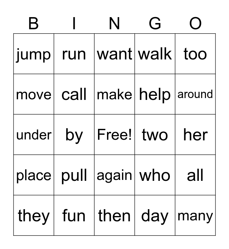 This bingo card has a free space and 24 words: pull, fun, make, they, too, jump, move, run, two, again, help, under, who, all, call, day, her, want, around, by, many, place, walk and then.