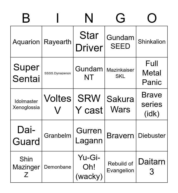 This bingo card has a free space and 24 words: Granbelm, Demonbane, Gundam NT, Shin Mazinger Z, Shinkalion, Aquarion, Super Sentai, Rayearth, Sakura Wars, Gurren Lagann, Mazinkaiser SKL, Idolmaster Xenoglossia, Bravern, Diebuster, SSSS.Dynazenon, Rebuild of Evangelion, Brave series (idk), Star Driver, Full Metal Panic, Voltes V, Daitarn 3, Dai-Guard, Gundam SEED and Yu-Gi-Oh! (wacky).