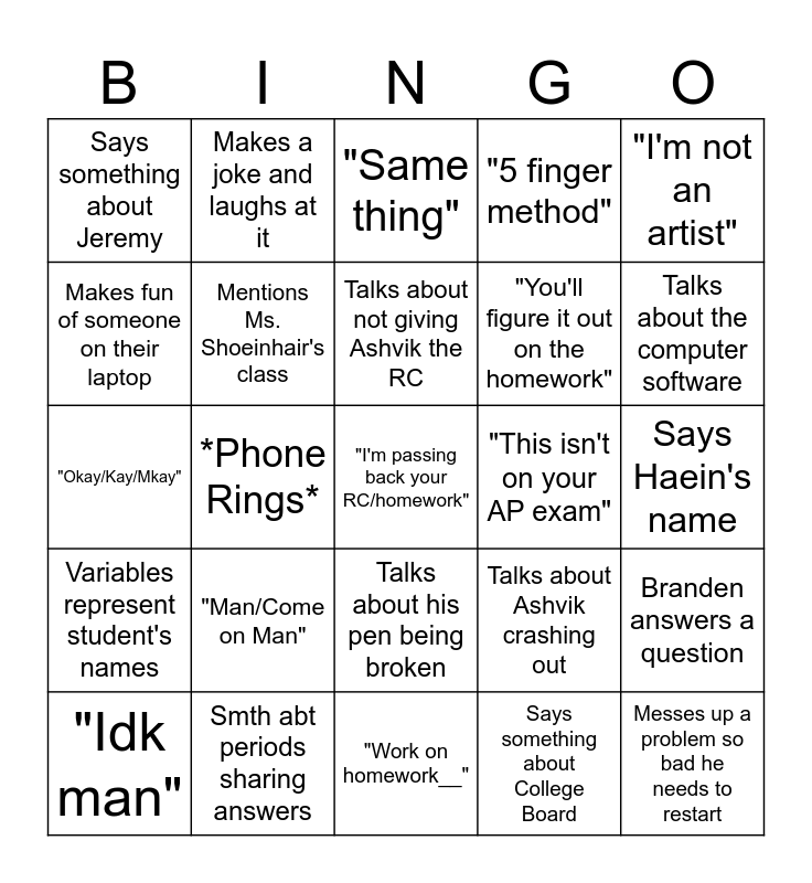 This bingo card has a free space and 24 words: "Man/Come on Man", Smth abt periods sharing answers, Talks about not giving Ashvik the RC, "Idk man", "I'm not an artist", Says something about Jeremy, Makes fun of someone on their laptop, Makes a joke and laughs at it, "This isn't on your AP exam", Talks about his pen being broken, "You'll figure it out on the homework", "Okay/Kay/Mkay", Talks about Ashvik crashing out, Branden answers a question, Mentions Ms. Shoeinhair's class, Says something about College Board, Says Haein's name, "Same thing", Talks about the computer software, *Phone Rings*, Messes up a problem so bad he needs to restart, Variables represent student's names, "5 finger method" and "Work on homework__".