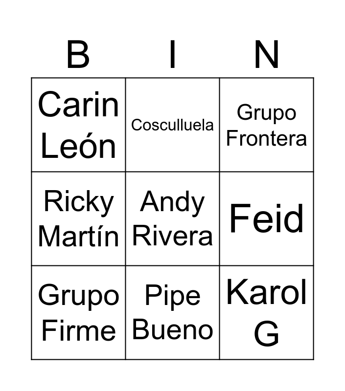 This bingo card has 15 words: Free!, Blessd, Grupo Frontera, Carin León, Pipe Bueno, Andy Rivera, Kapo, Rayan Castro, Feid, Karol G, Wolfine, Ricky Martín, Grupo Firme, Cosculluela and Reik.