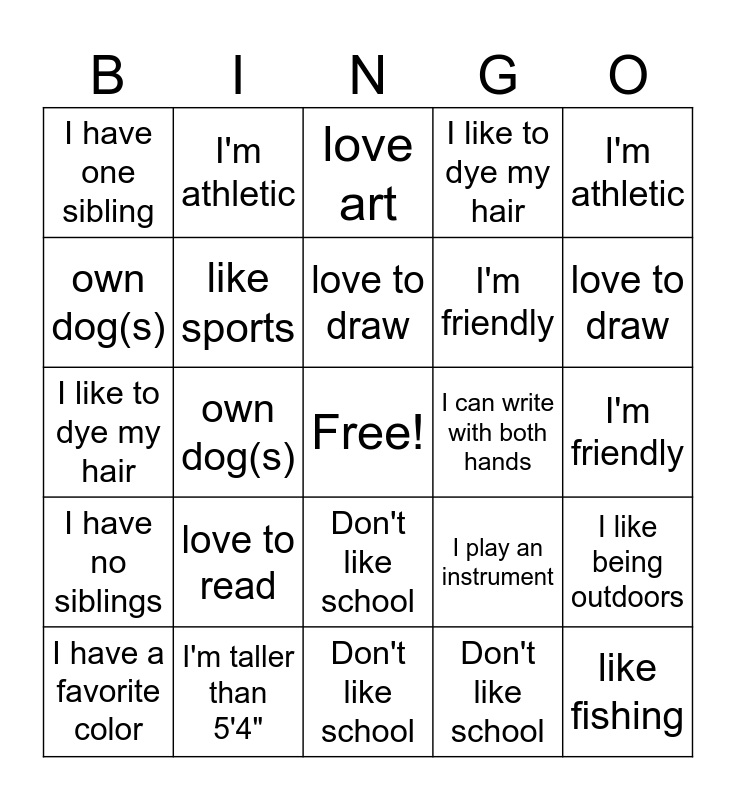 ⚠ This card has duplicate items: Own cat(s) (2), I'm taller than 5'4" (2), I love school (2), I have no siblings (2), Don't like school (3), like or love bowling (2), like sports (2), I have 2 or more siblings (2), I'm friendly (2), love to read (2), I like to dye my hair (3), love to sleep (3), own dog(s) (2), I don't like public speaking (2), I like ice cream (2), like fishing (2), I'm athletic (2), School is alright (2), love to draw (2), I can write with both hands (2), love art (2), I have a favorite color (2), I like being outdoors (2)