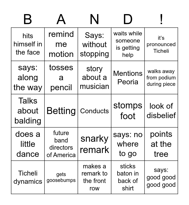 This bingo card has a free space and 24 words: future band directors of America, gets goosebumps, story about a musician, Ticheli dynamics, it’s pronounced Ticheli, hits himself in the face, says: along the way, remind me motion, stomps foot, snarky remark, Mentions Peoria, Talks about balding, says: no where to go, points at the tree, tosses a pencil, sticks baton in back of shirt, look of disbelief, Says: without stopping, walks away from podium during piece, Betting, says: good good good good, does a little dance, waits while someone is getting help and makes a remark to the front row.