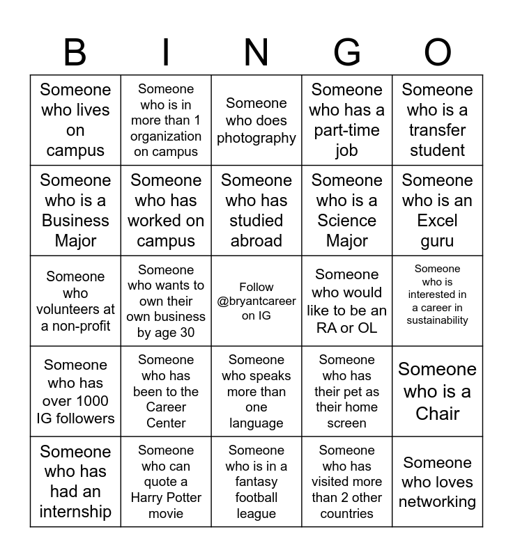 This bingo card has a free space and 29 words: Someone who has had an internship, Someone who is planning on going to graduate school, Someone who wants to own their own business by age 30, Someone who say the alphabet backwards, Someone who lives on campus, Someone who does photography, Someone who has worked on campus, Someone who has been to the Career Center, Someone who would like to be an RA or OL, Someone who can quote a Harry Potter movie, Someone who is interested in a career in sustainability, Someone who loves networking, Someone who is in a fantasy football league, Someone who has visited more than 2 other countries, Someone who is an Excel guru, Someone who has more than 3 pets, Someone who speaks more than one language, Someone who has over 1000 IG followers, Someone who is a transfer student, Someone who volunteers at a non-profit, Someone who has their pet as their home screen, Someone who speaks Spanish, Someone who is a Science Major, Someone who is a Business Major, Someone who has a part-time job, Someone who is in more than 1 organization on campus, Someone who is a Chair, Someone who has studied abroad and Someone who is currently a Junior.