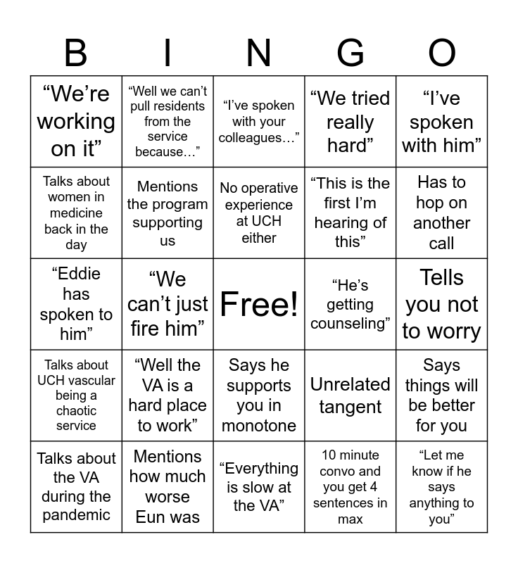 This bingo card has a free space and 24 words: “Well the VA is a hard place to work”, Mentions how much worse Eun was, No operative experience at UCH either, Talks about the VA during the pandemic, “I’ve spoken with him”, “We’re working on it”, Talks about women in medicine back in the day, “Well we can’t pull residents from the service because…”, “He’s getting counseling”, Says he supports you in monotone, “This is the first I’m hearing of this”, “Eddie has spoken to him”, Unrelated tangent, Says things will be better for you, Mentions the program supporting us, 10 minute convo and you get 4 sentences in max, Tells you not to worry, “I’ve spoken with your colleagues…”, Has to hop on another call, “We can’t just fire him”, “Let me know if he says anything to you”, Talks about UCH vascular being a chaotic service, “We tried really hard” and “Everything is slow at the VA”.