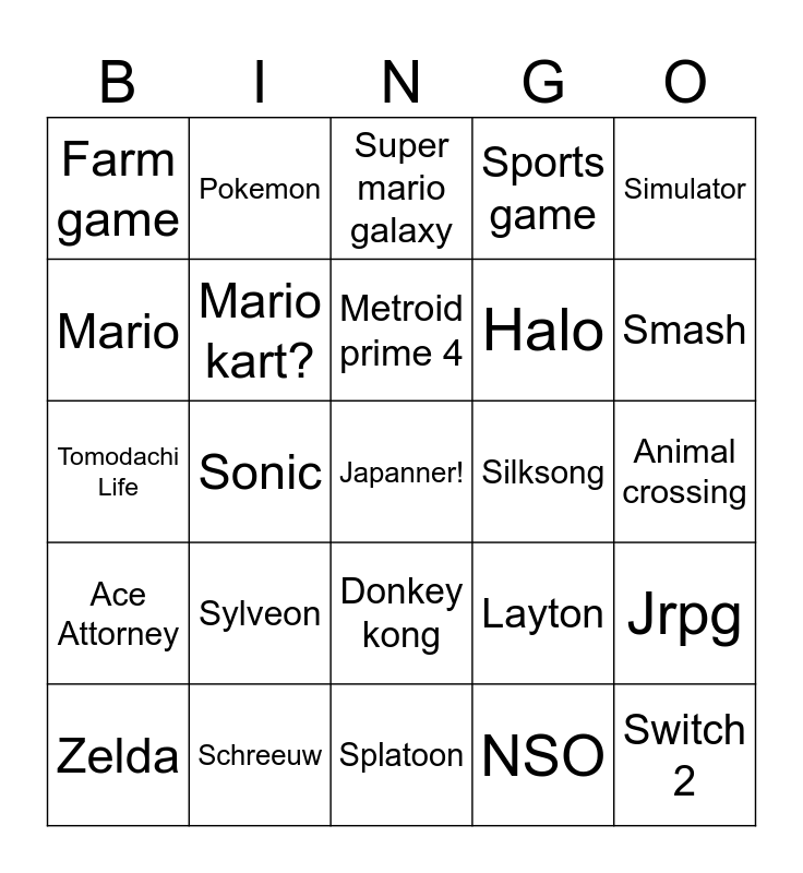 This bingo card has a free space and 24 words: Sylveon, Schreeuw, Metroid prime 4, Zelda, Simulator, Farm game, Mario, Pokemon, Silksong, Donkey kong, Halo, Tomodachi Life, Layton, Jrpg, Mario kart?, NSO, Animal crossing, Super mario galaxy, Smash, Sonic, Switch 2, Ace Attorney, Sports game and Splatoon.