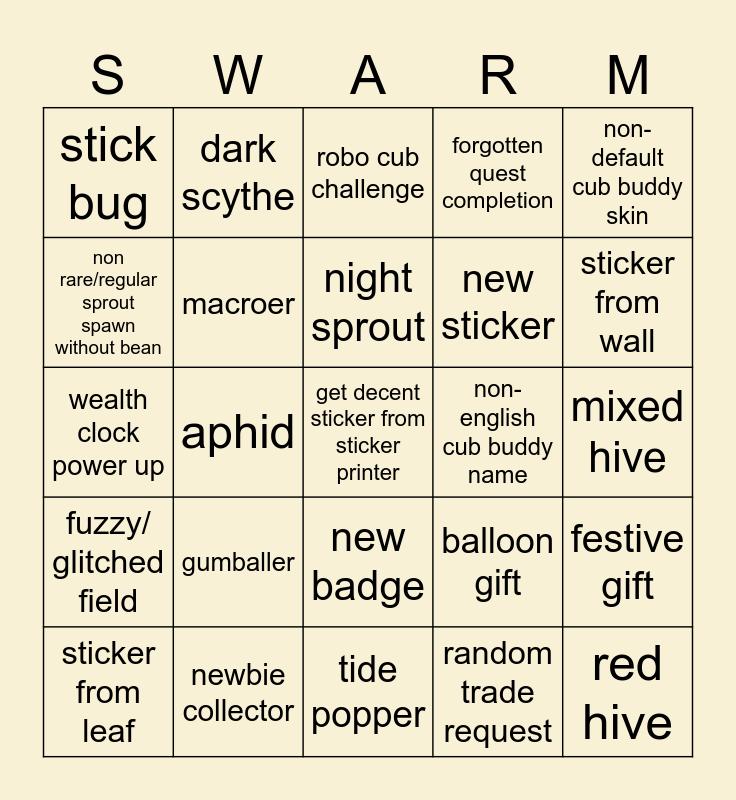 This bingo card has 35 words: activate windy bee fight, share jellybean with someone, active vicious bee fight, macroer, new badge, forgotten quest completion, non rare/regular sprout spawn without bean, get decent loot from bug, night sprout, awesome loot from memory match, wealth clock power up, non-default cub buddy skin, insensitive/ offensive cub buddy name, chatter, stick bug, non-english cub buddy name, random trade request, aphid, fuzzy/ glitched field, get decent sticker from sticker printer, balloon gift, sticker from leaf, festive gift, newbie collector, robo cub challenge, sticker from wall, red hive, snowbear, new sticker, mixed hive, blue hive, tide popper, gumballer, dark scythe and pollen dipper.