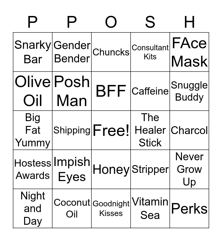 This bingo card has a free space and 24 words: Impish Eyes, Coconut Oil, BFF, Night and Day, FAce Mask, Snarky Bar, Olive Oil, Gender Bender, The Healer Stick, Honey, Caffeine, Big Fat Yummy, Stripper, Never Grow Up, Posh Man, Vitamin Sea, Charcol, Chuncks, Snuggle Buddy, Shipping, Perks, Hostess Awards, Consultant Kits and Goodnight Kisses.