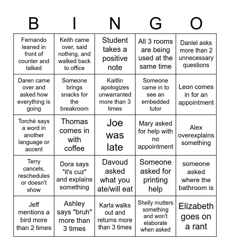 This bingo card has a free space and 24 words: Dora says "it's cuz" and explains something, Ashley says "bruh" more than 3 times, Kaitlin apologizes unwarranted more than 3 times, Jeff mentions a bird more than 2 times, Daniel asks more than 2 unnecessary questions, Fernando leaned in front of counter and talked, Daren came over and asked how everything is going, Keith came over, said nothing, and walked back to office, Mary asked for help with no appointment, Davoud asked what you ate/will eat, Someone came in to see an embedded tutor, Torché says a word in another language or accent, Someone asked for printing help, someone asked where the bathroom is, Someone brings snacks for the breakroom, Shelly mutters something and won't elaborate when asked, Alex overexplains something, Student takes a positive note, Leon comes in for an appointment, Thomas comes in with coffee, Elizabeth goes on a rant, Terry cancels, reschedules or doesn't show, All 3 rooms are being used at the same time and Karla walks out and returns more than 3 times.