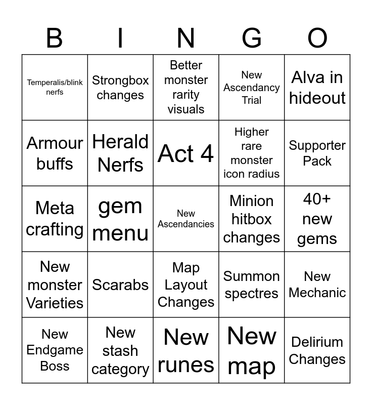 This bingo card has a free space and 24 words: Scarabs, New stash category, Act 4, New Endgame Boss, Alva in hideout, Temperalis/blink nerfs, Armour buffs, Strongbox changes, Minion hitbox changes, Map Layout Changes, Higher rare monster icon radius, Meta crafting, Summon spectres, New Mechanic, Herald Nerfs, New map, 40+ new gems, Better monster rarity visuals, Supporter Pack, gem menu, Delirium Changes, New monster Varieties, New Ascendancy Trial and New runes.
