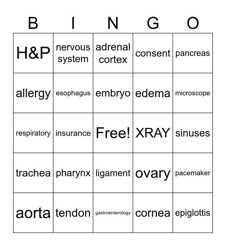 This bingo card has a free space and 94 words: appendectomy, electrolytes, gastroenterology, cardiology, epithelial, endocrine, pericardium, aorta, ventricle, purkinje, dystolic, systolic, pulmonary, edema, STEMI, pancreas, adrenal cortex, thyroid, digestive, skeletal, hypertension, gastritis, liver, gallbladder, pharynx, esophagus, WBC, RBC, plasma, cartilage, tendon, ligament, arthritis, epilepsy, nervous system, urethra, prostate, hormones, embryo, ovary, respiratory, trachea, sinuses, lungs, epiglottis, bronchioles, dyspena, asthma, kidney, retina, pupil, cornea, cataracts, glaucoma, patient, medication, prescription, vaccine, triage, EKG, insurance, H&P, vitals, tachycardia, bradycardia, procedure, diagnosis, treatment, allergy, PPE, AED, laceration, contusion, venipuncture, consent, capillary, centrifuge, microscope, pacemaker, referrals, insurance, schedule, EMR, XRAY, H&P, ICD-10, CPT code, HMO, PPO, CHAMPVA, TriCare, Medicare, HIPPA and OSHA.