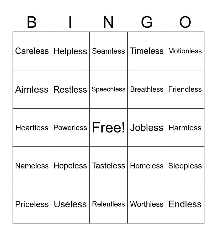 This bingo card has a free space and 24 words: Hopeless, Useless, Speechless, Priceless, Motionless, Careless, Aimless, Helpless, Jobless, Tasteless, Breathless, Heartless, Homeless, Sleepless, Restless, Worthless, Harmless, Seamless, Friendless, Powerless, Endless, Nameless, Timeless and Relentless.