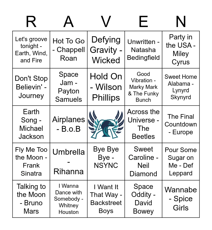 This bingo card has a free space and 29 words: Talking to the Moon - Bruno Mars, Before He Cheats - Carrie Underwood, Airplanes - B.o.B, Since You've Been Gone - Kelly Clarkson, Let's groove tonight - Earth, Wind, and Fire, Defying Gravity - Wicked, Space Jam - Payton Samuels, Umbrella - Rihanna, Across the Universe - The Beetles, I Wanna Dance with Somebody - Whitney Houston, The Final Countdown - Europe, Wannabe - Spice Girls, I Want It That Way - Backstreet Boys, Space Oddity - David Bowey, Sweet Home Alabama - Lynyrd Skynyrd, Hey Ya! - Outkast, Bye Bye Bye - NSYNC, Fly Me Too the Moon - Frank Sinatra, Party in the USA - Miley Cyrus, Earth Song - Michael Jackson, Sweet Caroline - Neil Diamond, Drops of Jupiter - Train, Good Vibration - Marky Mark & The Funky Bunch, Don't Stop Believin' - Journey, Unwritten - Natasha Bedingfield, Hot To Go - Chappell Roan, Pour Some Sugar on Me - Def Leppard, Hold On - Wilson Phillips and Livin' On a Prayer - Bon Jovi.