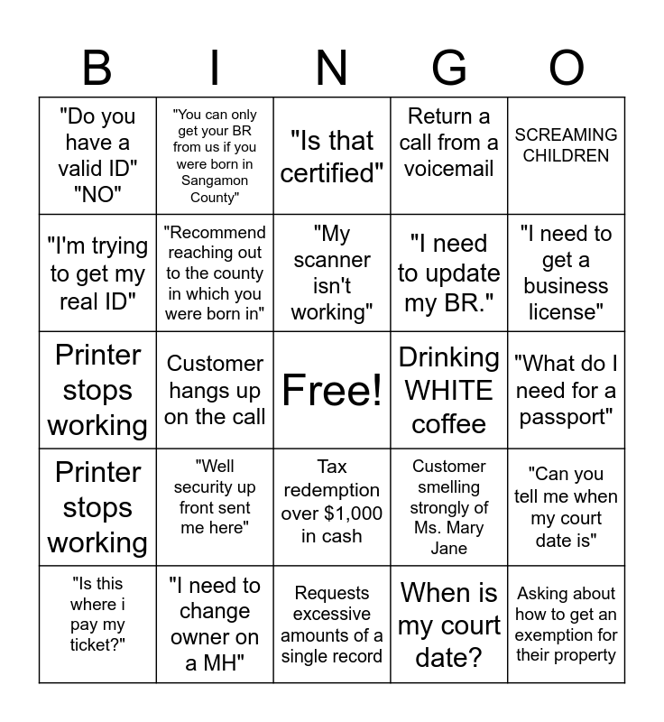 This bingo card has a free space and 26 words: Tax redemption over $1,000 in cash, When is my court date?, "My scanner isn't working", "I need to change owner on a MH", SCREAMING CHILDREN, "Do you have a valid ID" "NO", "I'm trying to get my real ID", "You can only get your BR from us if you were born in Sangamon County", "What do I need for a passport", Customer smelling strongly of Ms. Mary Jane, "I need to update my BR.", Printer stops working, "Can you tell me when my court date is", "Is this where i pay my ticket?", Customer hangs up on the call, "Can you tell me how much I payed in property taxes last year", Return a call from a voicemail, Printer stops working, "Is that certified", Asking about how to get an exemption for their property, "I need to get a business license", Requests excessive amounts of a single record, Drinking WHITE coffee, "Well security up front sent me here", "Recommend reaching out to the county in which you were born in" and Didn't Balance Drawer.