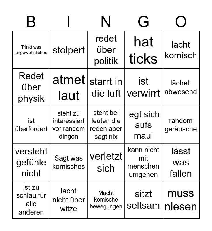 This bingo card has 25 words: Sagt was komisches, Macht komische bewegungen, starrt in die luft, ist zu schlau für alle anderen, lacht komisch, Trinkt was ungewöhnliches, Redet über physik, stolpert, legt sich aufs maul, verletzt sich, ist verwirrt, ist überfordert, kann nicht mit menschen umgehen, lässt was fallen, atmet laut, muss niesen, random geräusche, redet über politik, lächelt abwesend, steht zu interessiert vor random dingen, steht bei leuten die reden aber sagt nix, lacht nicht über witze, versteht gefühle nicht, hat ticks and sitzt seltsam.