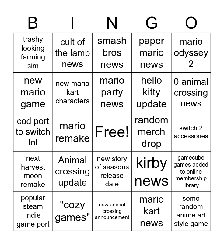 This bingo card has a free space and 24 words: Animal crossing update, "cozy games", mario party news, popular steam indie game port, mario odyssey 2, trashy looking farming sim, new mario game, cult of the lamb news, random merch drop, new story of seasons release date, hello kitty update, cod port to switch lol, kirby news, gamecube games added to online membership library, new mario kart characters, mario kart news, switch 2 accessories, smash bros news, 0 animal crossing news, mario remake, some random anime art style game, next harvest moon remake, paper mario news and new animal crossing announcement.