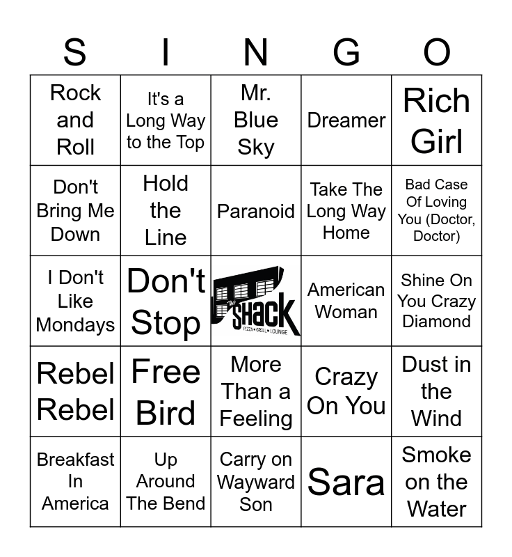 This bingo card has a free space and 75 words: Ride Like the Wind, Wonderful Tonight, Mr. Blue Sky, Fat Bottomed Girls, Gypsy, Renegade, I Want You to Want Me, Black Dog, Movin' Out (Anthony's Song), Imagine, Every 1's a Winner, Right Down the Line, Paranoid, Don't Bring Me Down, Reelin' In The Years, Don't Stop, Midnight Rider, Smoke on the Water, The Things We Do For Love, Rich Girl, Black Betty, I Don't Like Mondays, Hold the Line, It's a Long Way to the Top, Dreamer, Crocodile Rock, Say You Love Me, One Way Or Another, Night Moves, New York Groove, Old Man, Can't You See, Because the Night, Crazy On You, Bad Case Of Loving You (Doctor, Doctor), Take The Long Way Home, Stairway to Heaven, Right Place Wrong Time, Shine On You Crazy Diamond, Sara, All Right Now, Since You Been Gone, Run Through The Jungle, Roundabout, Solsbury Hill, Cecilia, Breakfast In America, Rock and Roll, Love Of My Life, Blinded By The Light, Take It Easy, More Than a Feeling, My Sharona, The Joker, Sweet Emotion, Live And Let Die, Long Train Runnin', Bennie And The Jets, The Boys Are Back In Town, (Don't Fear) The Reaper, Free Bird, Surrender, Old Time Rock & Roll, Fly Like An Eagle, Ballroom Blitz, American Woman, Dirty Deeds Done Dirt Cheap, Angie, School's Out, Dust in the Wind, Rebel Rebel, Up Around The Bend, Comfortably Numb, Carry on Wayward Son and Spirit in the Sky.